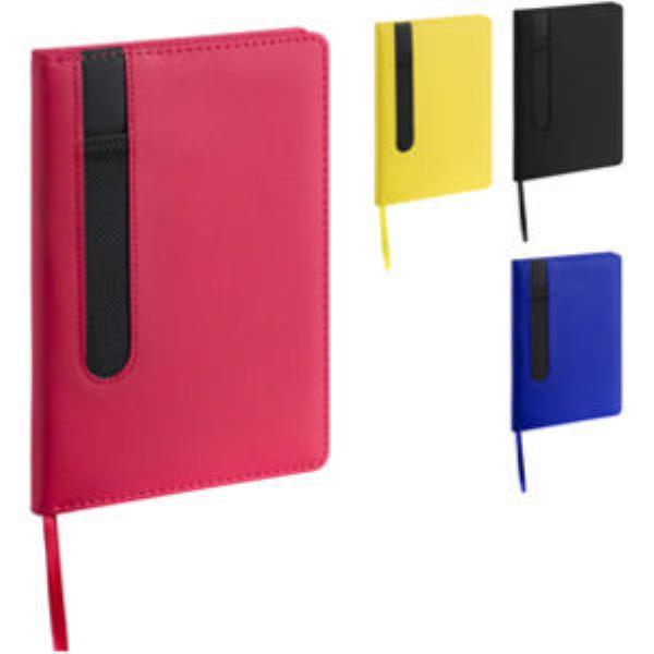 PU soft feel notebook with 80 sheets of plain paper, ribbon page marker and pen slot on front cover.