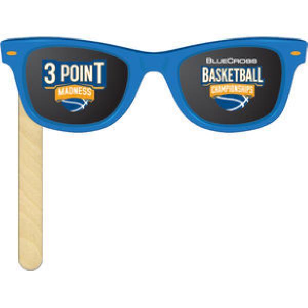 SUNGLASSES (DIGITAL). Suitable for promotional and party events. Product made of high density 12 pt. white paper board and liquid laminated front with a coated back. Finished with a 15-cm wooden stick. Printed full colour, both sides.
