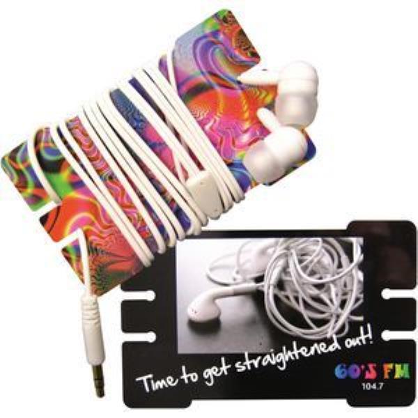 Printed plastic card specially shaped for winding earphone cable around, to reduce knots and tangles. Full colour print on both sides, with gloss finish.