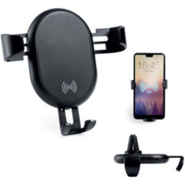 Ventilation grille smartphone holder with integrated wireless charger. In an elegant black colour design, with auto adjust mechanism, using the weight of the phone itself. Presented in an attractive design box.