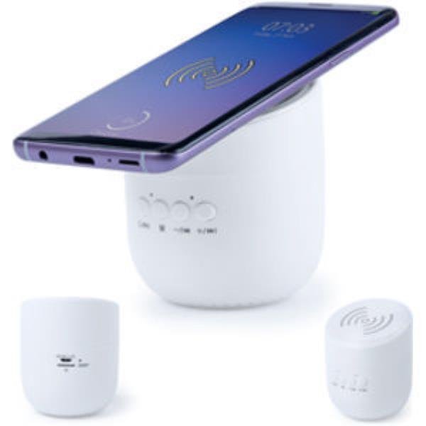 Compact and smart, white colour design speaker with integrated wireless charger. Bluetooth connectivity, with lithium battery and 3W power. Handsfree function, slot for micro SD card, nonslip base and rechargeable via USB cable included. Presented in an attractive design box.