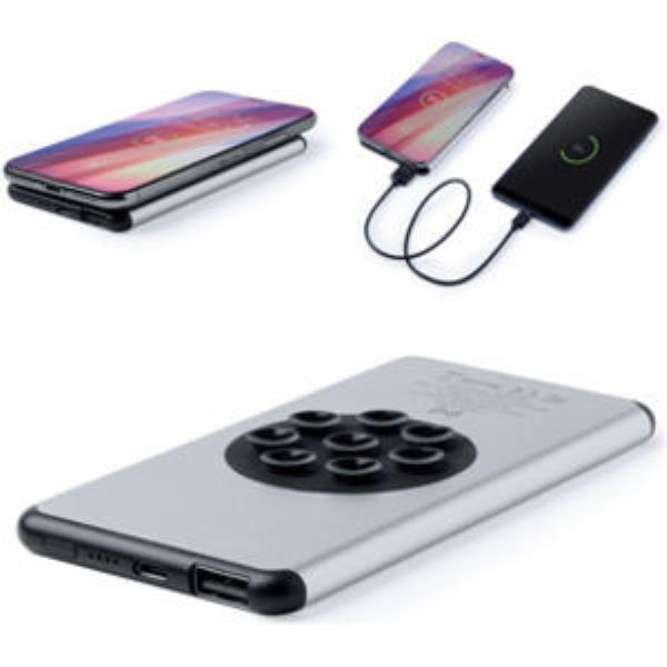 5,000 mAh, external auxiliary battery with wireless and wired charging mode. Aluminum case, ultra flat design, with suction pads docking and inputoutput micro USB port cable included. Wide printing area and presented in an attractive, individual design box.