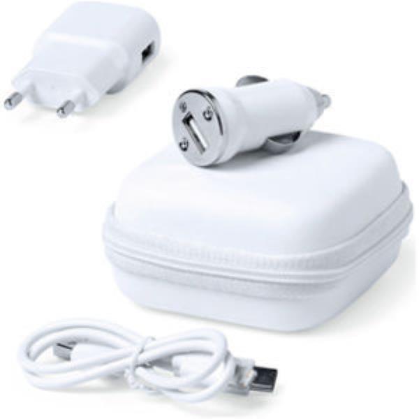 Set of USB chargers for car and wall. Car charger with charging indicator, wall socket charger and charging cables with connections TypeC, dual Micro USB and Lightning. 1,000 mAh charging capacity, in an elegant white colour design, and presented in an individual PU case in matching colour.