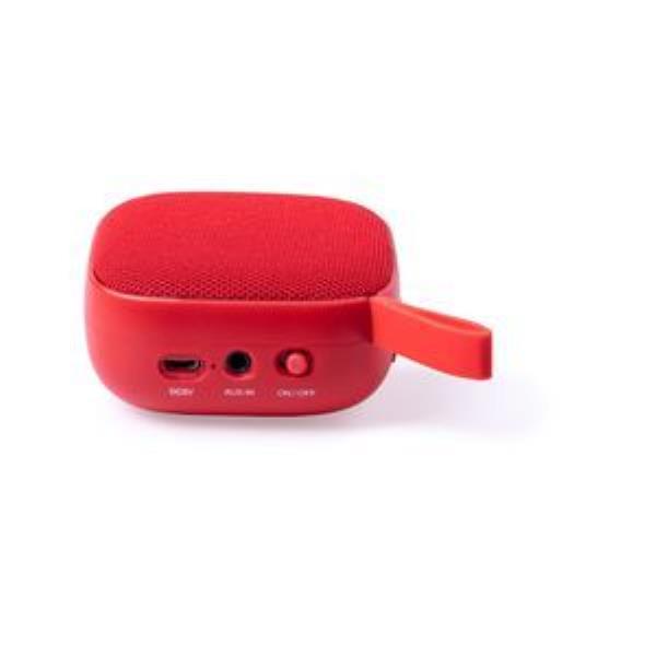 Vibrant square wireless speaker with Bluetooth connection, volume control buttons and auxiliary input. This modern speaker is available in a variety of bold colours and is designed with a carry strap for convenient travel. Power 3W and cable included.