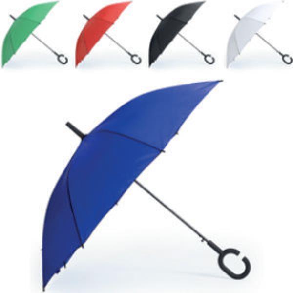 Automatic windproof umbrella with a black metal shaft and 'C' shaped handle. The shaped handle allows for better grip in harsh weather and also allows for it to be hung on certain surfaces. Perfect for a rainy day.