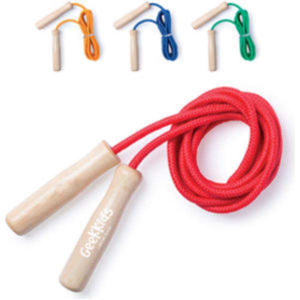 240cm length jumping rope in bright tones and with comfortable, lacquered, wooden handles. Folded presentation.