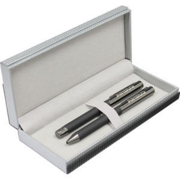 Twist action ballpen and matching pull off cap rollerball with soft black rubber slender barrel and contrasting polished gunmetal metal upper body, clip and nib. Parker style black ink refill as standard.