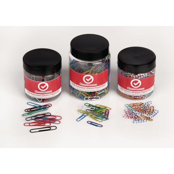 Bright multicoloured striped paperclips. 25mm. Tub of 500.