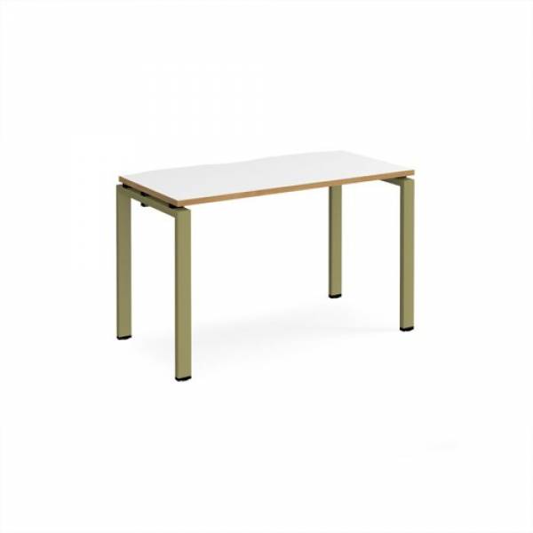 | Single straight desks 600mm deep with scalloped cut outs in the desktops |