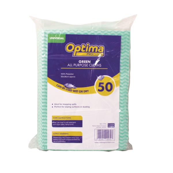 A semi disposable, absorbent and lightweight non woven all purpose cloth. Manufactured from spun lace material which is perfect for general purpose cleaning and has remarkable strength in all directions. Spunlace fabric also has the added benefit of a soft feel which is closer to traditional textiles than other non wovens. Supplied in attractive packaging under Ramon’s Optima Proclean brand, this cloth is certified as food contact safe. Therefore they are ideal for foodservice environments where the cloth is likely to some into contact with dry, moist or fatty foodstuffs. Available in 4 hygiene colours. Absorbent. Wet or Dry Use.