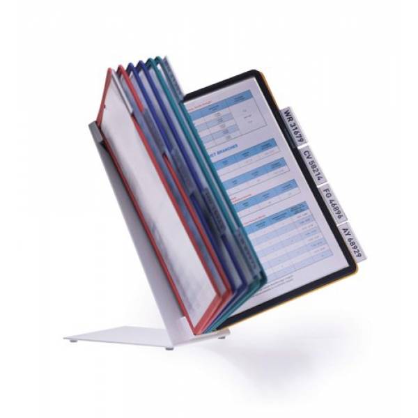 The DURABLE VARIO® range is a robust and economical display panel system with a sturdy metal base. Ideal for use in industrial areas and offices. This desk unit includes 10 A4 display panels and tabs. The panels are anti-glare and copy-proof which makes it easy to use. Great for holding health and safety instructions, machine manuals, etc.