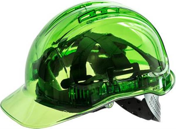 Portwest exclusive design and Patented Model. Tranlucent shell to see through peak and sides: allows the wearer to look upwards without the need to tilt the head.Extra strong yet ultra lightweight Polycarbonate shell offering UV rays protection.6 points textile harness adjustable size. Non Vented.