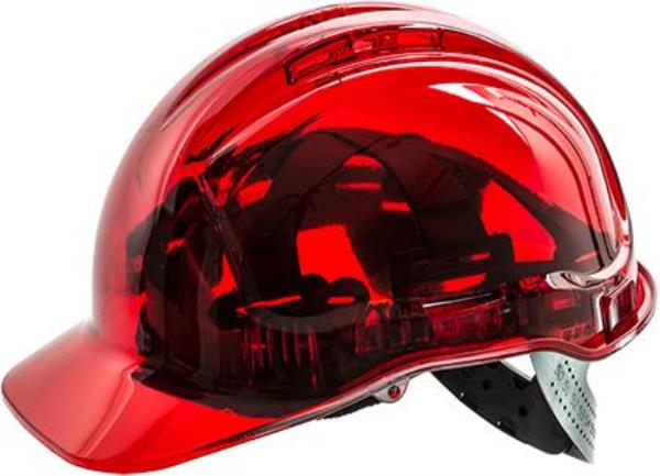 Portwest exclusive design and Patented Model. Tranlucent shell to see through peak and sides: allows the wearer to look upwards without the need to tilt the head.Extra strong yet ultra lightweight Polycarbonate shell offering UV rays protection.6 points textile harness adjustable size. Non Vented.