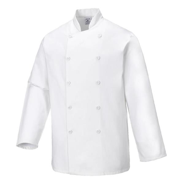 This jacket is the ultimate in wearer comfort. Made from 100% premium cotton, it is absorbent and comfortable next to the skin. The double-breasted front and rubber button features enhance the classic styling of this garment.