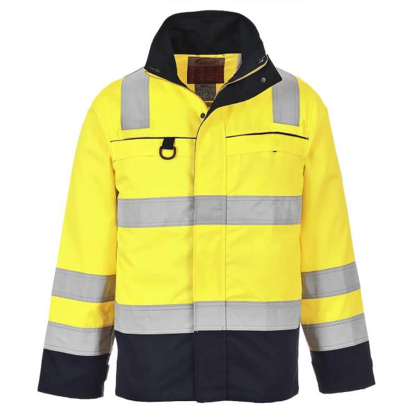 FR61 is constructed with highly innovative Bizflame Multi fabric. This comfortable garment offers protection against multiple risks including exposure to heat, fire, chemicals, electrical arcs and welding. Features include twin-stitched Hi-Vis strips on chest, arms and shoulders, concealed 2-way front brass zip and two concealed front chest pockets with piping detail.