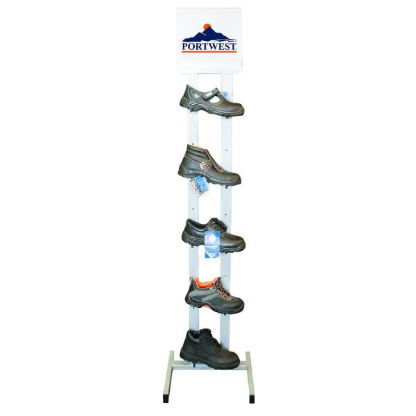 Newly designed slimline footwear display. Five interchangable shelves that can be set to different heights, allowing for display of shoes, boots, riggers and wellingtons on the one stand.