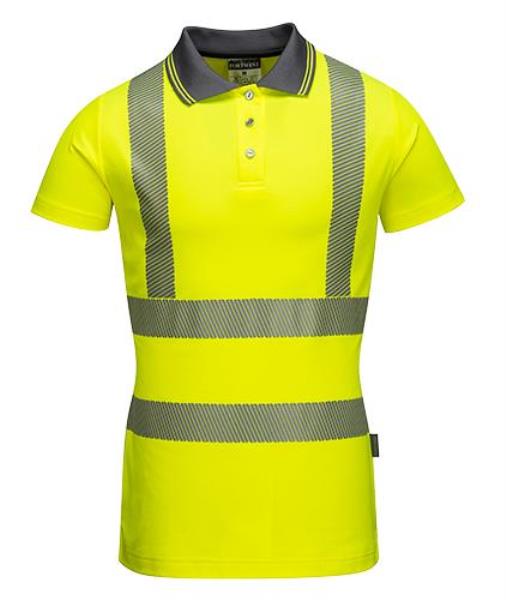 This contemporary ladies polo shirt combines breathable Cotton Comfort fabric with HiVisTex Pro tape. This garment offers outstanding freedom of movement while holding a feminine fit.