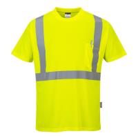 This pocket t-shirt uses moisture wicking polyester fabric. Features include a pocket on the left chest, a crew neck, a taped neck seam for extra comfort and reflective heat seal tape for enhanced visibility.